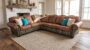 Mint-hued geometric patterns introduce a refreshing pop of color, adding depth and visual balance to the sectional’s rugged character. Plush seat cushions and wide rolled arms provide exceptional comfort, while hand-applied nailhead trim and artisan detailing ensure each sectional carries its own distinctive character.