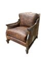 Hand-applied nailhead trim traces the leather's edge in deliberate rows, each one set by hand rather than shot from a pneumatic gun. The finish on the carved wood frame carries subtle distressing that echoes the leather's lived-in warmth. These details aren't decorative afterthoughts — they're the signatures of furniture built by people who sign their work.