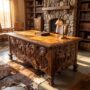 The interior is equally functional: two deep drawers on the left pedestal for files and daily essentials, with a cabinet panel on the right for storage or display. The work surface is wide enough to feel commanding and quiet enough, grain-wise, to keep the eye from wandering too far from the carving.