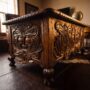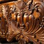 Crafted from solid reclaimed wood and finished in a rich, sun-warmed tone, this executive desk is a work of hand-carved art — one that took a master craftsman hours, not machines, to bring to life. The front panel bears deep-relief baroque carving: acanthus leaves unfurling across every face, shell medallions anchoring the corners, and at the center — a carved grotesque mask that has watched over libraries and estudios for centuries. It is a desk that commands a room before anyone sits behind it.
