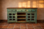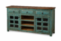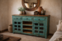 The Desert Verde Media Console doesn't whisper — it announces itself the moment you walk into the room. That hand-applied verde turquoise finish, distressed down to reveal veins of natural wood grain beneath, carries the sun-bleached patina of something that's weathered decades on a Sonoran porch. This is Southwestern color done right — bold enough to anchor a room, worn enough to feel like it's always been there.