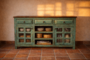The warm natural wood top creates the contrast that makes the verde sing. It's not painted to match; it's left honest, with the kind of rich amber tone that only comes from quality hardwood properly finished. Every piece carries its own distressing pattern — the turquoise wearing through differently on each console, ensuring yours looks like no one else's.