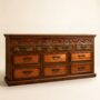 Every drawer front is sheathed in real hammered copper panels, each one hand-worked until the surface ripples with that distinctive sun-caught glow. The metal isn't uniform — it breathes, shifts, catches morning light differently than evening light. Above, the top rail features deeply carved scroll detailing that took generations of woodworking knowledge to execute with this precision.
