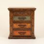 Solid wood construction forms the foundation, with hand-carved detailing along the top edge that you'll feel every time you reach for it in the dark. The hammered copper drawer fronts aren't veneer or foil — they're real metal, worked by hand until each panel carries its own topography of light and shadow.