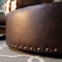 The side band is full-grain leather in a deep espresso finish — the kind of hide that shows its history in the grain, that pulls warm under light and darkens at the edges with honest use. Large antique brass nailhead trim runs the full base perimeter, domed and generously spaced, the way Western furniture hardware is supposed to look — not decorative, but definitive.