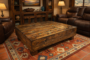 The Mesa Vein Turquoise Storage Coffee Table is a commanding, sculptural centerpiece that blends rugged ranch materials with refined western artistry. Handcrafted from thick, solid hardwood, this table features a deeply textured, distressed plank surface that highlights natural knots, weathered grain, and rich amber-brown tones for a truly aged, heirloom look.