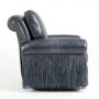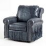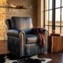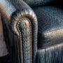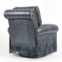 Every inch of this swivel recliner — seat, back cushion, rolled arms, and floor-length fringe skirt — is wrapped in full-grain leather embossed with a deep caiman scale pattern in a slate blue metallic finish. The embossing is pressed into the leather with precision-engraved steel plates, rendering every scale edge and belly ridge in crisp, consistent relief across each panel. In direct light, the slate blue surface shifts from steel blue to cold gunmetal — a finish that reads exotic from across a room and earns a second look up close. It does not look like any other chair in any other room. It is not meant to.