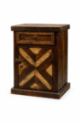 The upper drawer slides smooth on quality runners, sized right for the essentials you reach for in the dark. Below, a cabinet door with that signature cross-plank pattern swings open on sturdy hinges, offering concealed storage for everything else. Hand-forged hardware sits flush and functional — no decorative nonsense, just honest metalwork.