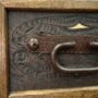 What stops people is the leatherwork. Each drawer carries a hand-tooled leather panel inset into the raised frame — dark brown hide with cream natural leather cutwork showing through the floral pattern, creating a pierced effect you cannot replicate with a printer or a stamp. The floral scrollwork is carved and cut by hand, the detail traceable with a fingertip. Forged iron bail handles hang heavy against each panel — hammered, dark, and built to last as long as the dresser itself.