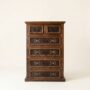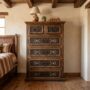 Built from solid pine with a deep, hand-applied finish that lets the natural knots and grain read through, this tall six-drawer chest is designed to stand with authority — wide enough to anchor a wall, tall enough to command the room. The structure is deliberate and clean: raised panel framing around every drawer face, smooth-glide action built for daily use over decades, nailhead accents running the base platform.