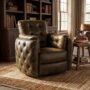 Hand-tufted cushioning runs in deep, structured rows across the seatback — not surface decoration, but intentional engineering that holds its shape through generations of weight and wear. Brass nailhead trim traces the rolled arms and base with old-world precision, each tack set by hand in our workshop. The 360-degree swivel moves with weighted smoothness, and the reclining mechanism engages without protest or rattle — hardware spec'd for inheritance, not replacement.